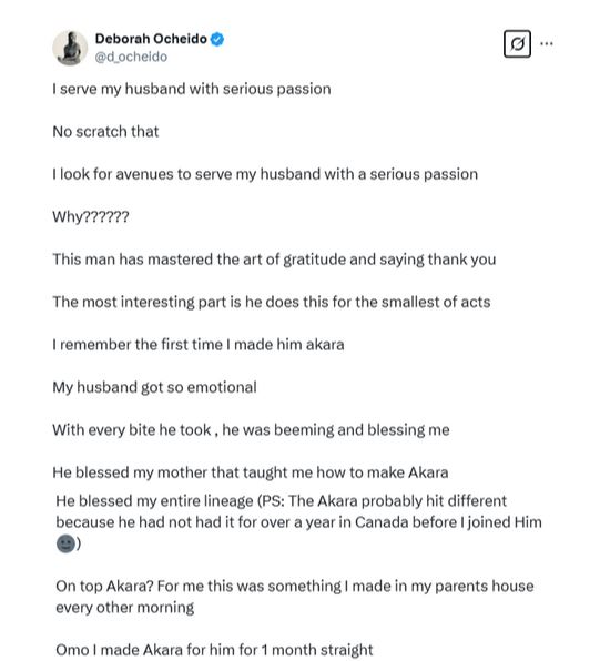 A Nigerian woman, Deborah Ocheido, has spoken about the reason she prioritizes her husband's wellbeing and serves him with ''serious passion''.