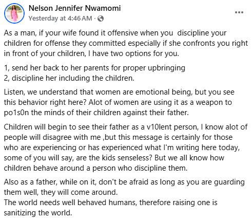 “As a man, if your wife found it offensive when you discipline your children for offense they committed especially if she confronts you right in front of your children, I have two options for you: 1, send her back to her parents for proper upbringing. 2, discipline her including the children,” she wrote in a Facebook post on Monday.