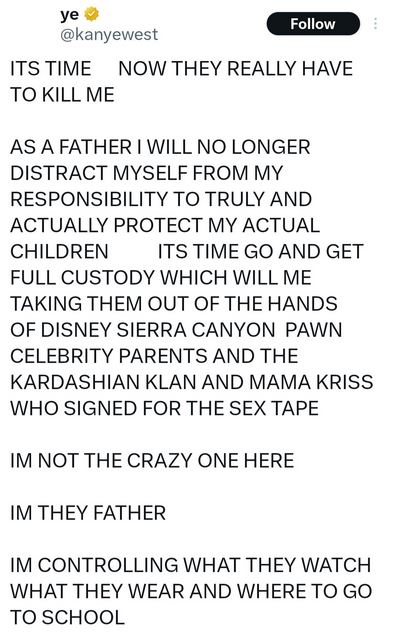 Controversial American rapper, Kanye West has shared series of disturbing social media posts making damning allegations against his ex-wife, Kim Kardashian and her family.