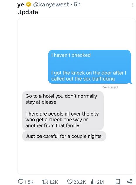 Later, in an update he shared screenshots of a chat, insinuating the Kardashians are coming after him following his s3x trafficking tweet.