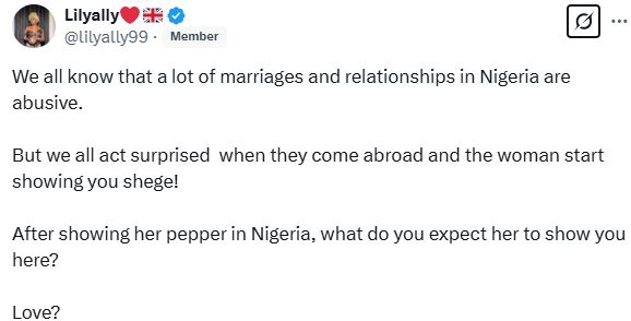 “We all know that a lot of marriages and relationships in Nigeria are abusive. But we all act surprised when they come abroad and the woman start showing you shege! After showing her pepper in Nigeria, what do you expect her to show you here? Love?,” she wrote in a Nigerian UK group page on Wednesday, March 19.