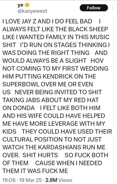 He later wrote of Jay-Z: "I LOVE JAY Z AND I DO FEEL BAD I ALWAYS FELT LIKE THE BLACK SHEEP LIKE I WANTED FAMILY IN THIS MUSIC SHIT I’D RUN ON STAGES THINKING I WAS DOING THE RIGHT THING AND WOULD ALWAYS BE A SLIGHT HOV NOT COMING TO MY FIRST WEDDING HIM PUTTING KENDRICK ON THE SUPERBOWL OVER ME OR EVEN US NEVER BEING INVITED TO SHIT TAKING JABS ABOUT MY RED HAT ON DONDA I FELT LIKE BOTH HIM AND HIS WIFE COULD HAVE HELPED ME HAVE MORE LEVERAGE WITH MY KIDS THEY COULD HAVE USED THEIR CULTURAL POSITION TO NOT JUST WATCH THE KARDASHIANS RUN ME OVER. SHIT HURTS SO FUCK BOTH OF THEM CAUSE WHEN I NEEDED THEM IT WAS F*CK ME."