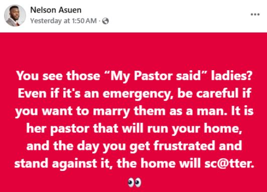 "You see those “My Pastor said” ladies? Even if it's an emergency, be careful if you want to marry them as a man. It is her pastor that will run your home, and the day you get frustrated and stand against it, the home will sc@tter,” he wrote in a Facebook post on Wednesday.