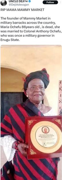 "The founder of Mammy Market in military barracks across the country, Maria Ochefu, 86 years old, is dead.