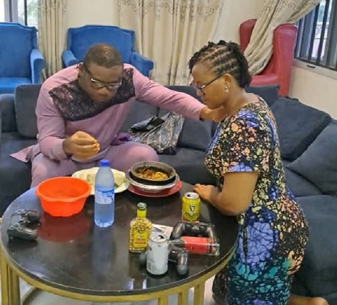 Some men on social media are reacting to a viral photo of a woman kneeling to serve her husband his meal.