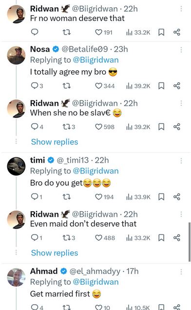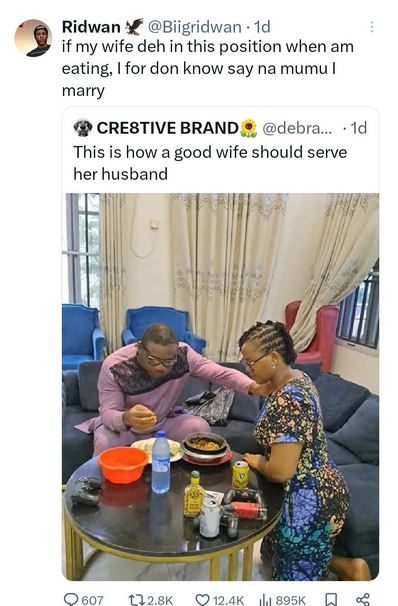 Another man responded: "if my wife deh in this position when am eating, I for don know say na mumu I marry."