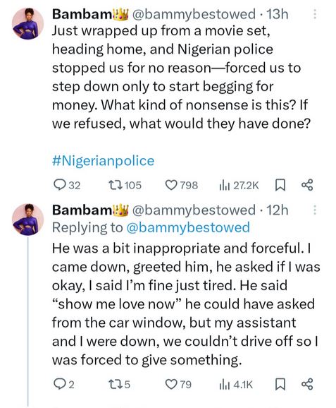 She took to the X platform to narrate how she was "forced to give something" when a police officer, who she alleges was "inappropriate and forceful", asked her to show him "love".