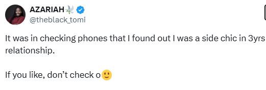 “It was in checking phones that I found out I was a side chick in 3yrs relationship. If you like, don’t check o,” Tomi wrote.