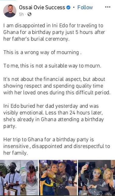 Ossai Ovie Success, a media aide to the Governor of Delta State, has taken a swipe at actress Ini Edo for attending a birthday party in Ghana less than 48 hours after her father’s funeral.
