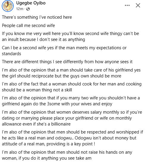 A Nigerian woman, Ugegbe Oyibo, has responded to trolls attacking her over her polygamous and traditional gender beliefs.