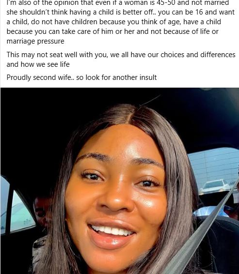 She stated that she is proud of being a second wife and does not care about the insults hurled at her for her choice.