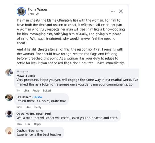 “If a man cheats, the blame ultimately lies with the woman. For him to have both the time and reason to cheat, it reflects a failure on her part. A woman who truly respects her man will treat him like a king—cooking for him, massaging him, satisfying him s3xually, and giving him peace of mind. With such treatment, why would he ever feel the need to cheat?,” she wrote in a Facebook post on Monday.