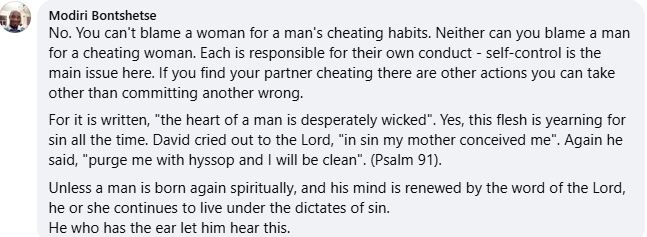 “And if he still cheats after all of this, the responsibility still remains with the woman. She should have recognized the red flags and left long before it reached this point. As a woman, it is your duty to refuse to settle for less. If you notice red flags, don't hesitate—leave immediately.”