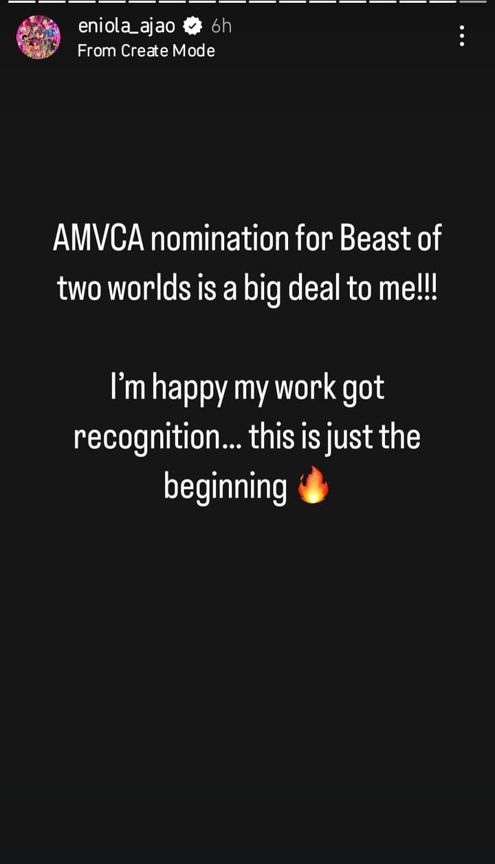 Nollywood actress and producer Eniola Ajao has reacted after her first Cinema movie bagged an AMVCA nomination.