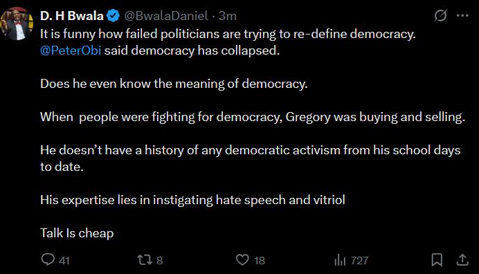 Bwala said Obi has never taken a stand in defence of democracy and is only making cheap talks.