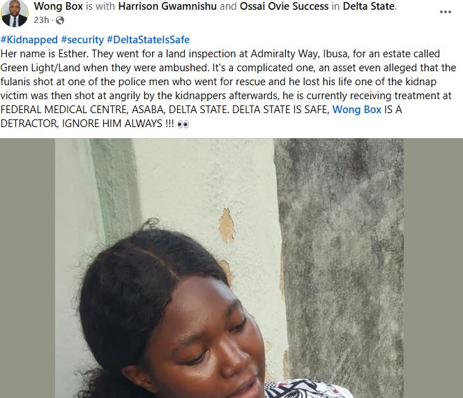 However, a Delta activist, Comrade Victor Ojie, also known as Wong Box, claimed that the kidnappers have k!lled Esther.