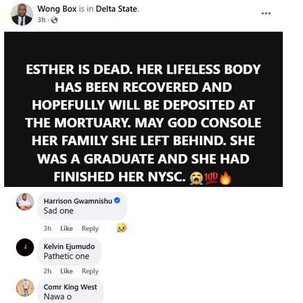 “ESTHER IS D3AD. HER LIFELESS BODY HAS BEEN RECOVERED AND HOPEFULLY WILL BE DEPOSITED AT THE MORTUARY. MAY GOD CONSOLE THE FAMILY SHE LEFT BEHIND. SHE WAS A GRADUATE AND SHE HAD FINISHED HER NYSC,” he wrote in a Facebook post on Tuesday, March 25.