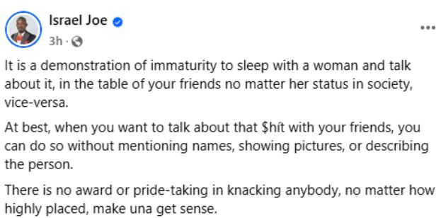 “It is a demonstration of immaturity to sleep with a woman and talk about it, in the table of your friends no matter her status in society, vice-versa. At best, when you want to talk about that $hít with your friends, you can do so without mentioning names, showing pictures, or describing the person. There is no award or pride-taking in knacking anybody, no matter how highly placed, make una get sense,” he wrote on Tuesday.