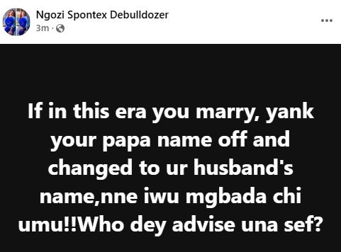 “If in this era you marry, yank your papa name off and changed to ur husband's name, nne iwu mgbada chi umu!!Who dey advise una sef?,” she wrote in a post on Thursday.