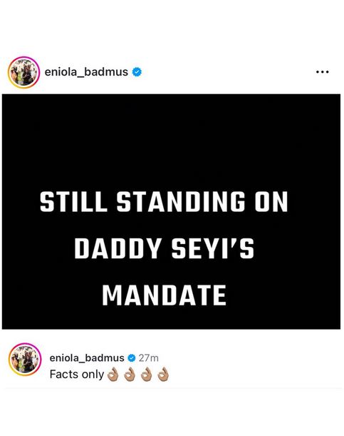Taking to Instagram, she stated that she is still standing on the mandate of Seyi Tinubu's father, Bola Tinubu, who is the president of Nigeria.