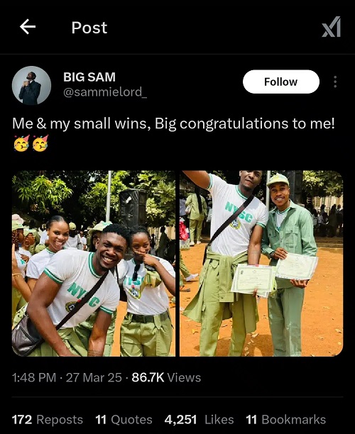 BBNaija Season 6 housemate Jacob Alifa aka Sammie has celebrated after completing his NYSC program.