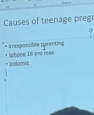 The causes of pregnancy displayed on the screen included irresponsible parenting, iPhone 16 Pro Max, and Indomie.