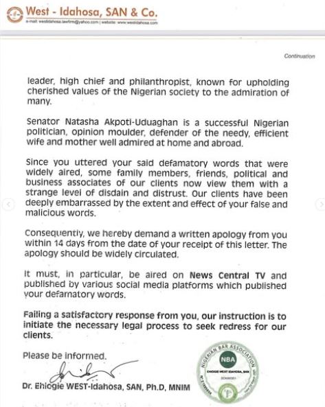 The letter from the law firm demands a public apology from Senator Nwaebonyi within 14 days, to be broadcast on News Central TV and widely shared across social media platforms.