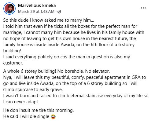 "I told him that even if he ticks all the boxes for the perfect man for marriage, I cannot marry him because he lives in his family house with no hope of leaving to get his own house in the nearest future, the family house is inside inside Awada, on the 6th floor of a 6 storey building,” she narrated in a Facebook post at the weekend.