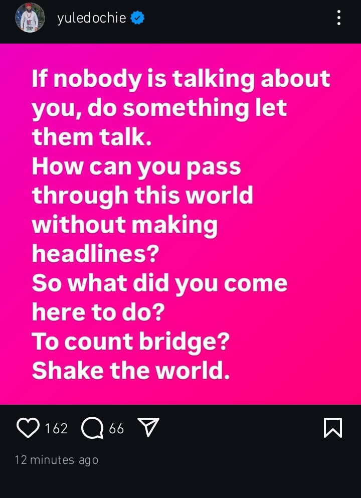Taking to his Instagram page, he urged his followers to do something that will make people talk about them.
