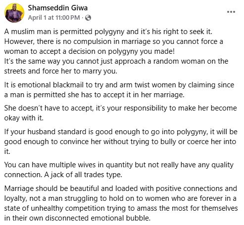“Muslim man is permitted polygyny and it’s his right to seek it. However, there is no compulsion in marriage so you cannot force a woman to accept a decision on polygyny you made! It’s the same way you cannot just approach a random woman on the streets and force her to marry you,” he wrote.
