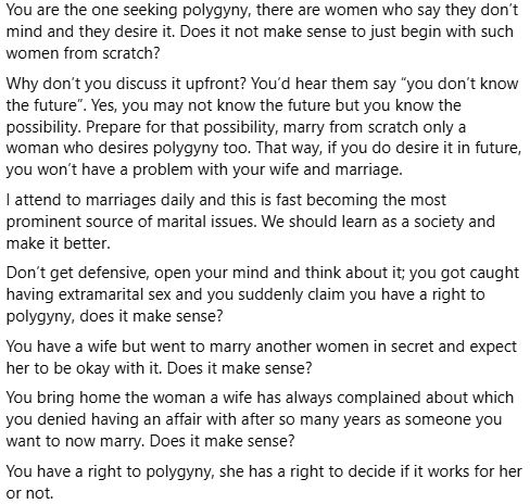 Don’t get defensive, open your mind and think about it; you got caught having extramarital sex and you suddenly claim you have a right to polygyny, does it make sense?