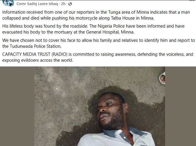 “Information received from one of our reporters in the Tunga area of Minna indicates that a man collapsed and d!ed while pushing his motorcycle along Talba House in Minna. His lifeless body was found by the roadside.