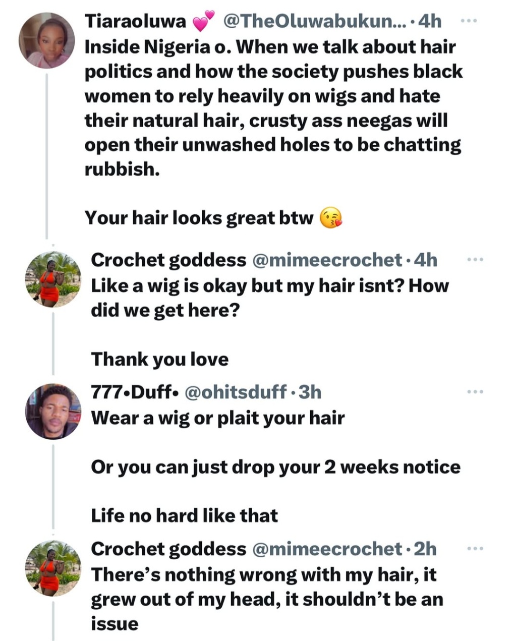 This has sparked a conversation about hair politics and how society forces black women to hate their natural selves and rely heavily on wigs.