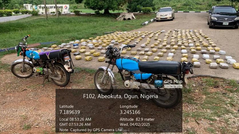 A total of 320 wraps of substance suspected to be Cannabis Sativa have been intercepted by the Nigerian Army operating under 81 Division, Kofo Abayomi, Lagos, from a suspected transnational drug syndicate, in Alamutu general area in Odeda Local Government Area of Ogun State.