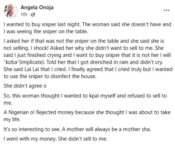 A Nigerian lady, Angela Onoja, has narrated her encounter with a shop owner who refused to sell to her, insecticide k!ller popularly known as sniper.