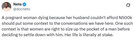 "A pregnant woman dying because her husband couldn't afford N500k should put some context to the conversations we have here.