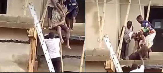 A video from the scene currently making the rounds on social media, shows the corpse of the deceased being brought down from the top of the building by some people in the area.