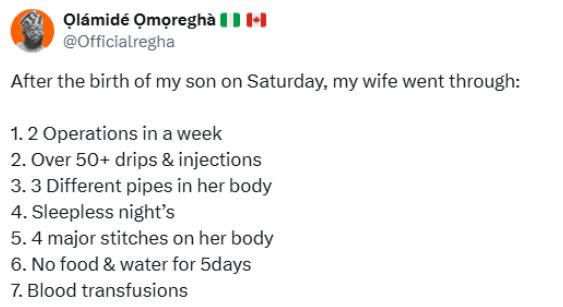 A Nigerian man, Olamide Omoregha, has appreciated his wife after she underwent two operations, had over “50 drips, injections, blood transfusions, major stitches” after she gave birth to their child.