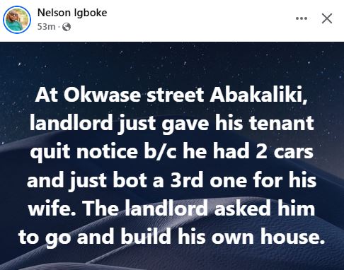 A man identified as Nelson Igboke has claimed that a landlord in Abakaliki, Ebonyi State gave one of his tenants a quit notice because he has two cars and recently bought a third one for his wife.