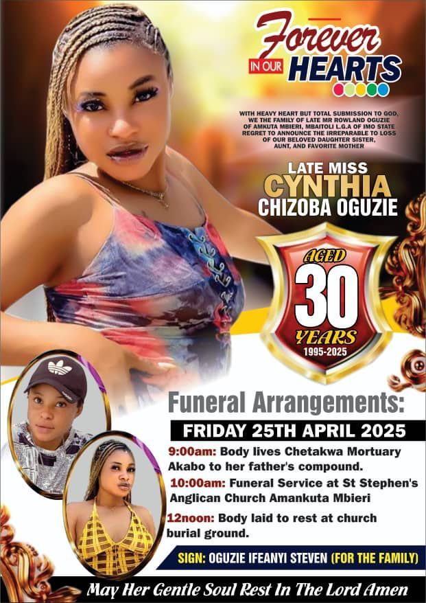 A Nigerian lady, Cynthia Chizoba Oguzie has died after a geepee tank fell inside her room.
