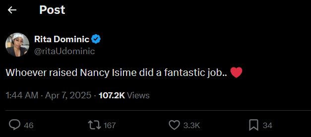Taking to her official X account, Dominic praised Isime’s upbringing, attributing her success to her parents’ influence.