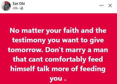 “No matter your faith and the testimony you want to give tomorrow. Don't marry a man that can't comfortably feed himself talk more of feeding you,” he wrote in a Facebook post on Thursday.