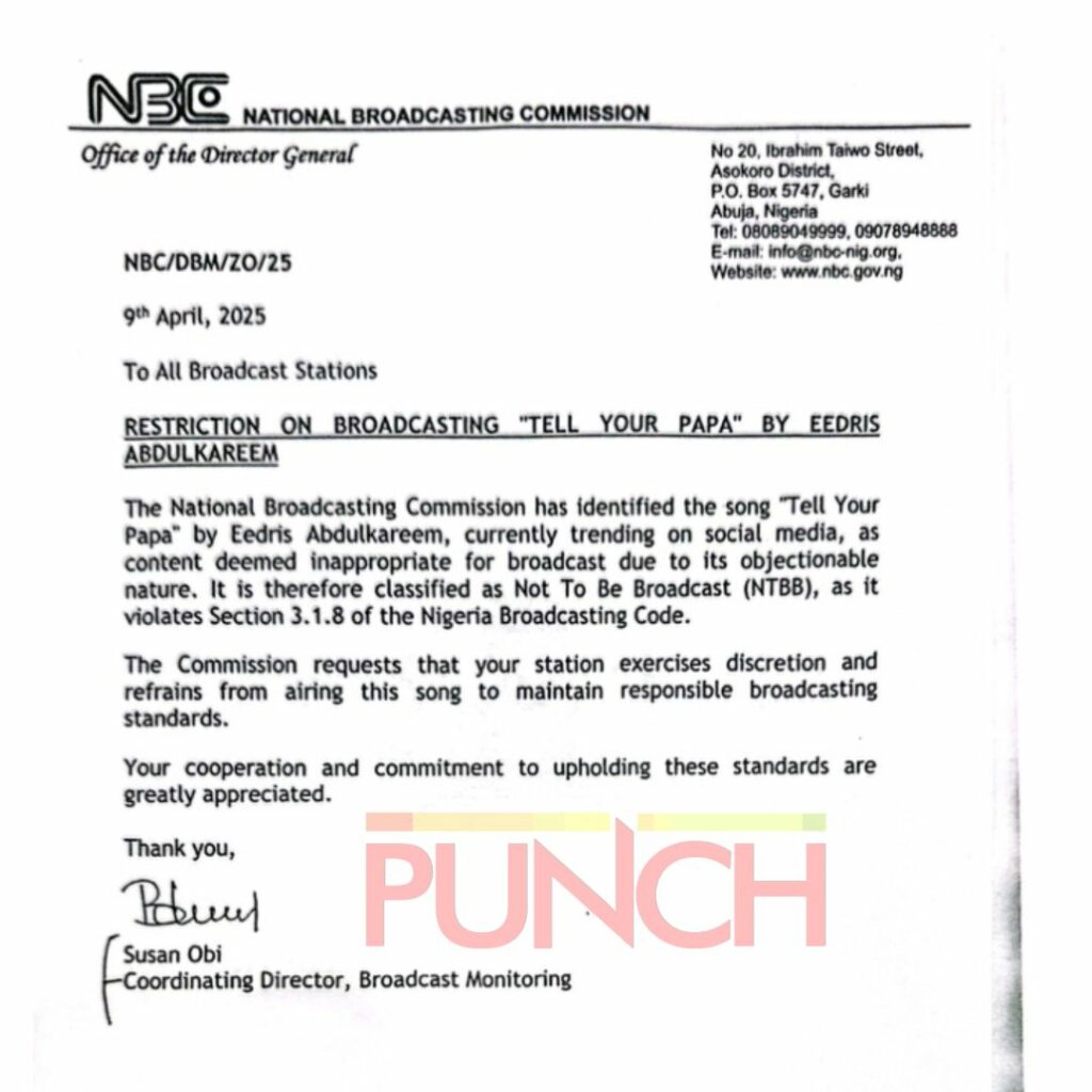 The statement titled, “Restriction on boradcasting ‘Tell Your Papa’ by Eedris Abdulkareem,’ read, “The National Broadcasting Commission has identified the song ‘Tell Your Papa’ by Eedris Abdulkareem, currently trending on social media, as content deemed inappropriate for broadcast due to its objectionable nature.