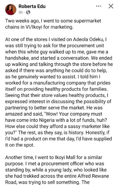She mentioned going to another mall and narrated how a different marketer who looked unkempt was turned back while she was attended to with respect.