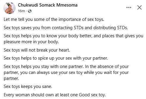 A Nigerian woman, Chukwudi Mmesoma, has advised women to own at least one good s3x toy.