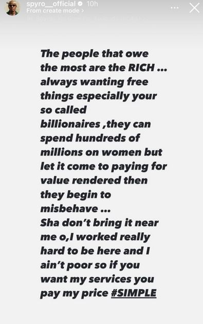 Popular Nigerian singer/songwriter, Spyro has opined that people who owe the most are wealthy people because they always want free things.