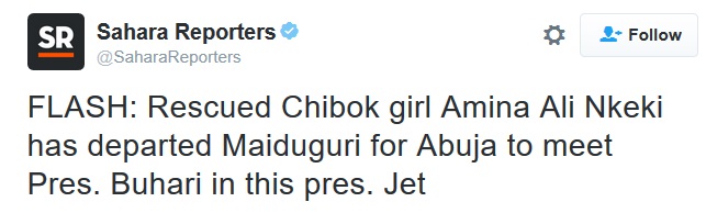 The Chibok schoolgirl who was rescued yesterday alongside her baby and Boko Haram husband, has departed to Abuja aboard a presidential jet to meet with President Buhari.