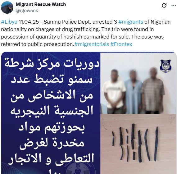 Migrant Rescue Watch in a post on Sunday, April 13, 2025, said the suspects were arrested with hashish drugs in Sabha, northeast of Sabha.