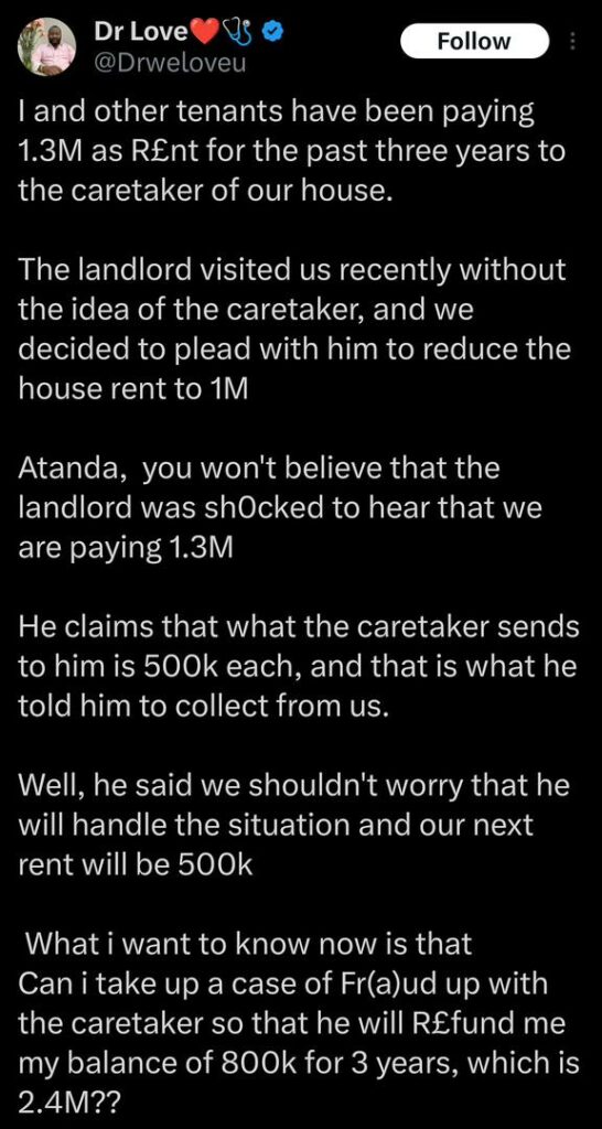 @Drweloveu on X (formerly Twitter) explained that the caretaker has been collecting N1.3 million annually for their apartments, when the actual rent should be N500,000.