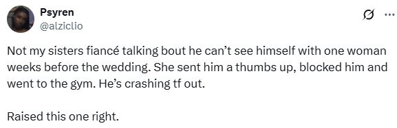“Not my sister's fiancé talking about he can’t see himself with one woman weeks before the wedding. She sent him a thumbs up, blocked him and went to the gym. He’s crashing tf out. Raised this one right,” she wrote.
